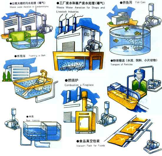 主要應(yīng)用于污水處理(曝氣)、粉體輸送(水泥、飼料等)、燃燒爐、沖洗、真空包裝。